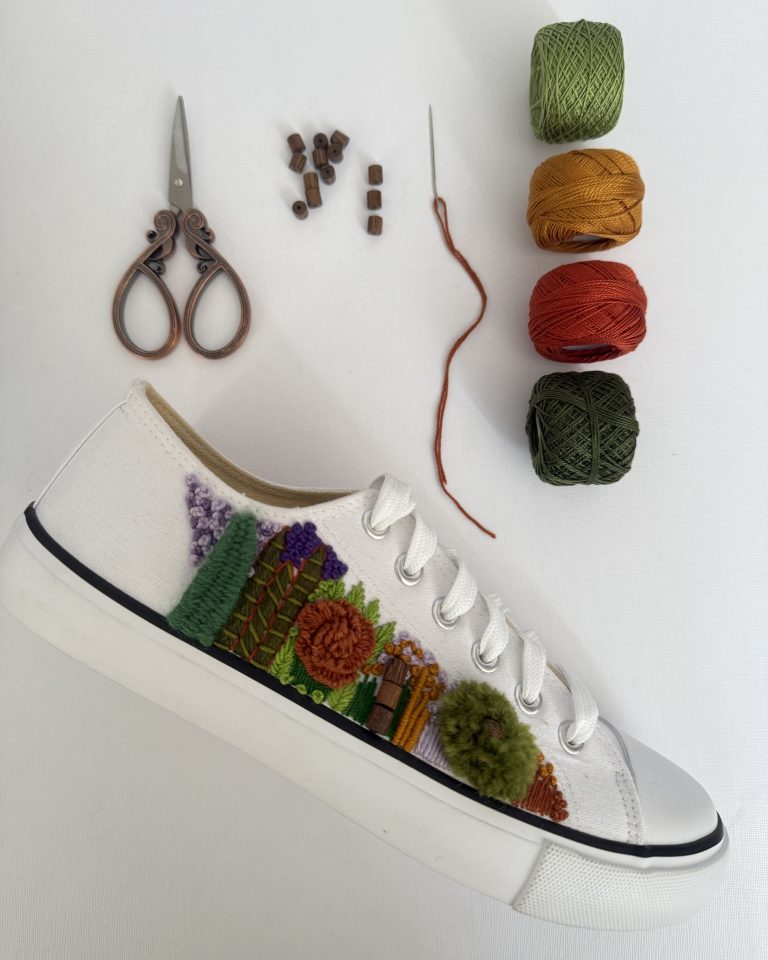Aprenderás 10 puntadas básicas e intermedias. Técnicas de bordado 3D y de relieve. Como aplicar abalorios. Bordarás y te llevarás tus zapatillas customizadas ✨ hechas por ti de principio a fin, para ti o para regalar estas Navidades 🎁